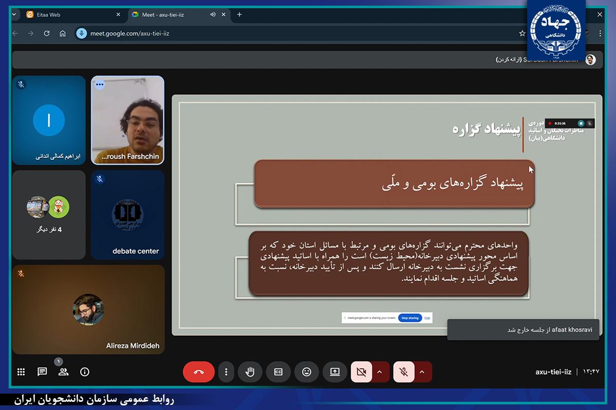 در ادامه، دربارهی شیوههای اجرایی طرح، چارچوب زمانی آن، ترکیب اساتید و گروههای مخاطب، توضیحاتی ارائهشد و گزارههای طرحشده، با محوریت مؤلفههای جغرافیایی و زیست محیطی، برای پیگیری و اجرا به واحدهای استانی سپرده شد تا هر استان بتواند با نگاهی بومی، مسائل و دغدغههای خاص خود را در قالب مناظره به میدان آورد.
